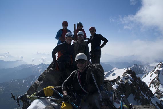 Danach ging die Kletterei im alpinen (Schwierigkeitsgrad 1-2) hoch auf 3500m Höhe. Dazwischen wurden die Steigeisen angeschnallt und einen kleinen Grad musste man bewältigen. Anschließend ging es mit Eispickel einer Firnflanke mit ca.20-25 Grad Steigung nach oben, wobei sich die Firnflanke im oberen Teil des Gipfels bis 50 Grad steigerte.
