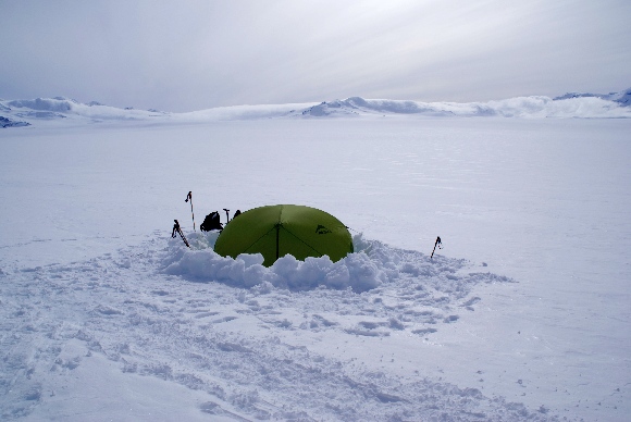 nach einen langen Tag schlagen wir windgeschützt hinter einer Felswand unser Zelt auf