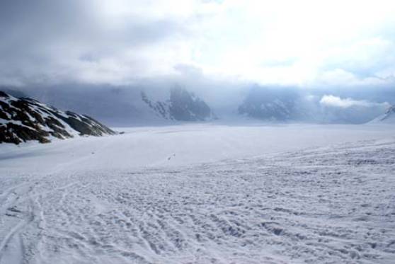 Aletschgletscher, dann geht’s links ab und teils steil bergauf zum Skidepot.