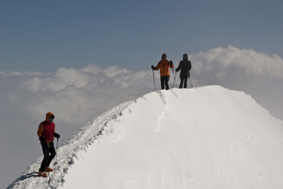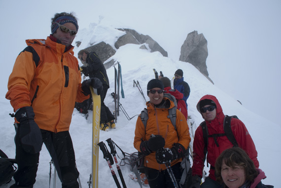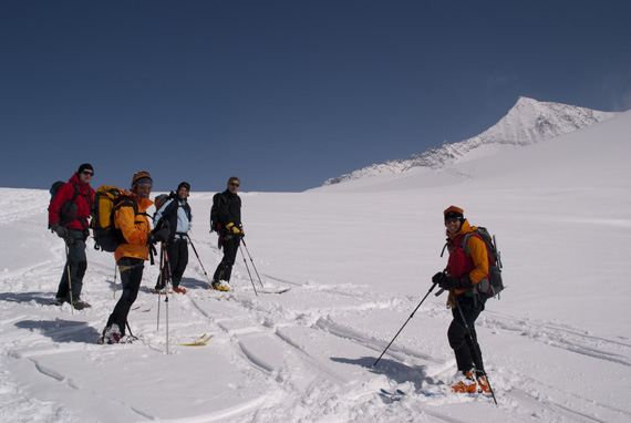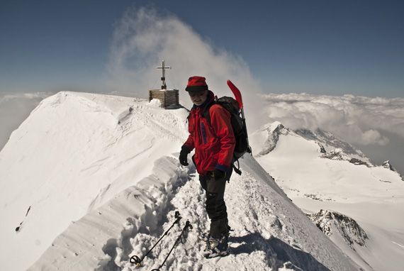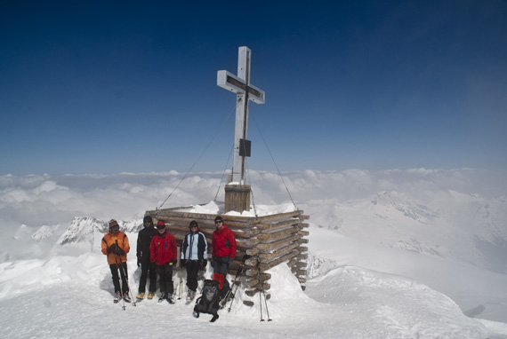 Und schließlich stehen wir am Skidepot, endlich steh ich vor dem schon so oft bewunderten schmalen Grat, geh´ ganz ehrfürchtig drüber und freu mich um 13:30 Uhr mit Max, Klaus, Peter, Gudrun und Kilian, tatsächlich auf dem Gipfel des Großvenedigers 3666m zu stehen.